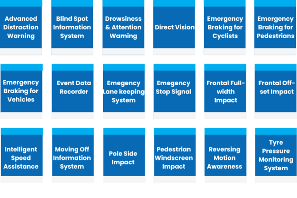 - Moving off information system (MOIS) – informs the driver when a pedestrian or cyclist is in the blind spot area in front of the vehicle and warns the driver when a moving off or low-speed impact with the vehicle front is likely.